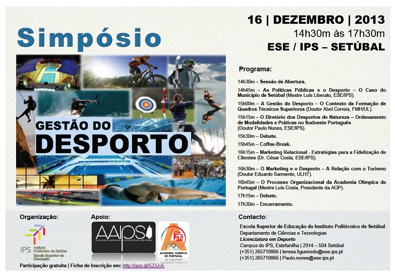 No próximo dia 16 de dezembro pretende-se realizar um "Simpósio de Gestão do Desporto" que terá lugar no Anfiteatro da Escola Superior de Educação do Instituto Politécnico de Setúbal, no período das 14h30m às 17h30m, na perspetiva do desenvolvimento de temas relacionados com a gestão do desporto e o seu mercado, criando um momento de reflexão, partilha de conhecimentos, competências e experiências, com o intuito de valorização pessoal e profissional de toda a comunidade educativa e demais interessados, em especial, os alunos da licenciatura em Desporto.