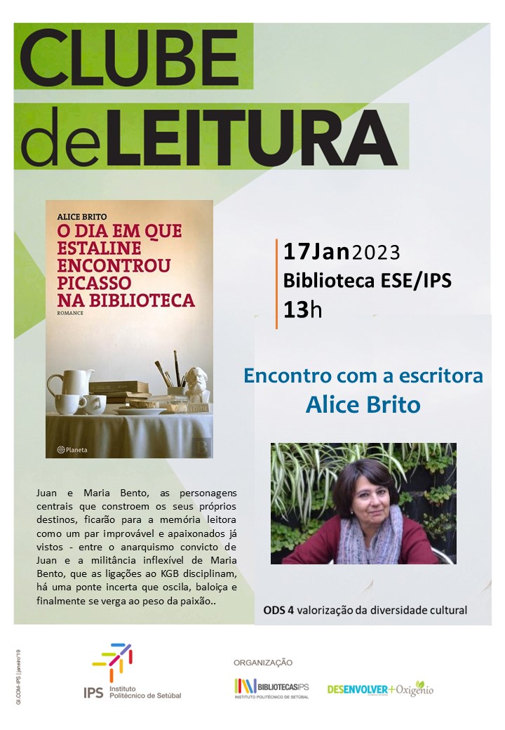 A próxima sessão do Clube de Leitura na SDI/Biblioteca da ESE será sobre o livro "O dia em que Estaline encontrou Picasso na Biblioteca" de Alice Brito. A autora estará presente no Clube de Leitura, no dia 17 de janeiro, entre as 13h e as 14h.