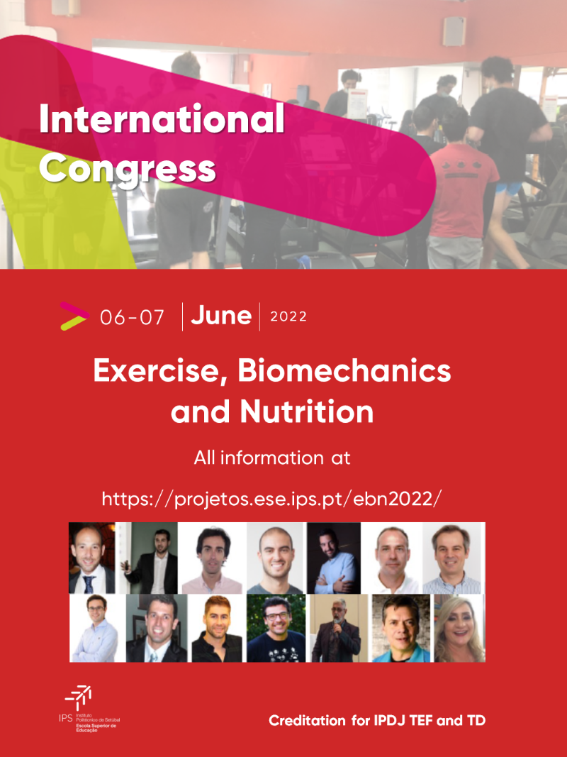 Congresso Internacional | Exercício, Biomecânica e Nutrição6 a 7 junho 2022 | presencial e online | Anfiteatro ESE/IPSNos próximos dias 6 e 7 de junho de 2022 irá decorrer na ESE/IPS o Congresso Internacional em Exercício, Biomecânica e Nutrição, com o objetivo da a divulgação de conhecimento acerca dos mais recentes desenvolvimentos na área do exercício físico e as suas implicações para a saúde, qualidade de vida e performance desportiva. Estarão presentes preletores de cinco instituições diferentes, com competências técnico cientificas reconhecidas mundialmente e que certamente contribuirão para o aumento das competências técnicas dos participantes.O congresso será presencial e online, com transmissão através da plataforma Zoom, disponível em https://videoconf-colibri.zoom.us/j/85021778304. Paar mais informações sobre o congresso, basta consultar o seu portal aqui.